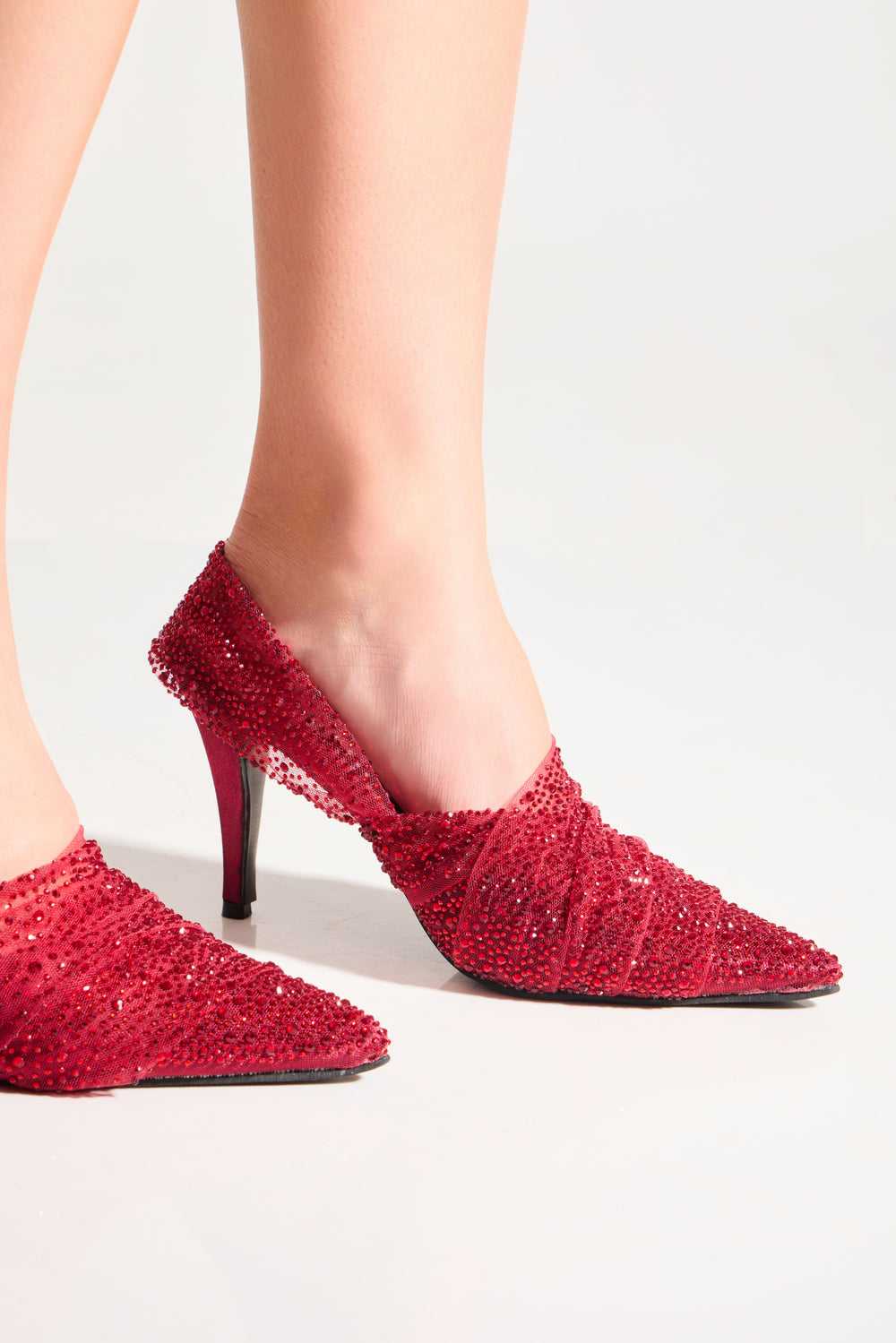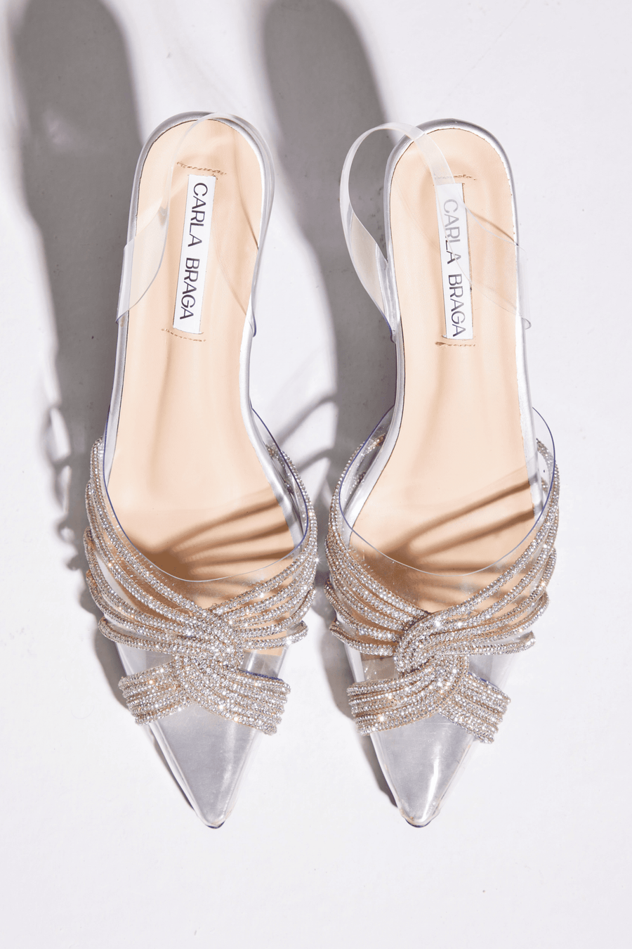Asta floats effortlessly along the foot, framed by a transparent upper that creates the illusion of crystals suspended in air. Stones trace the silhouette from front to back, wrapping the foot in luminous brilliance while preserving a barely-there elegance.