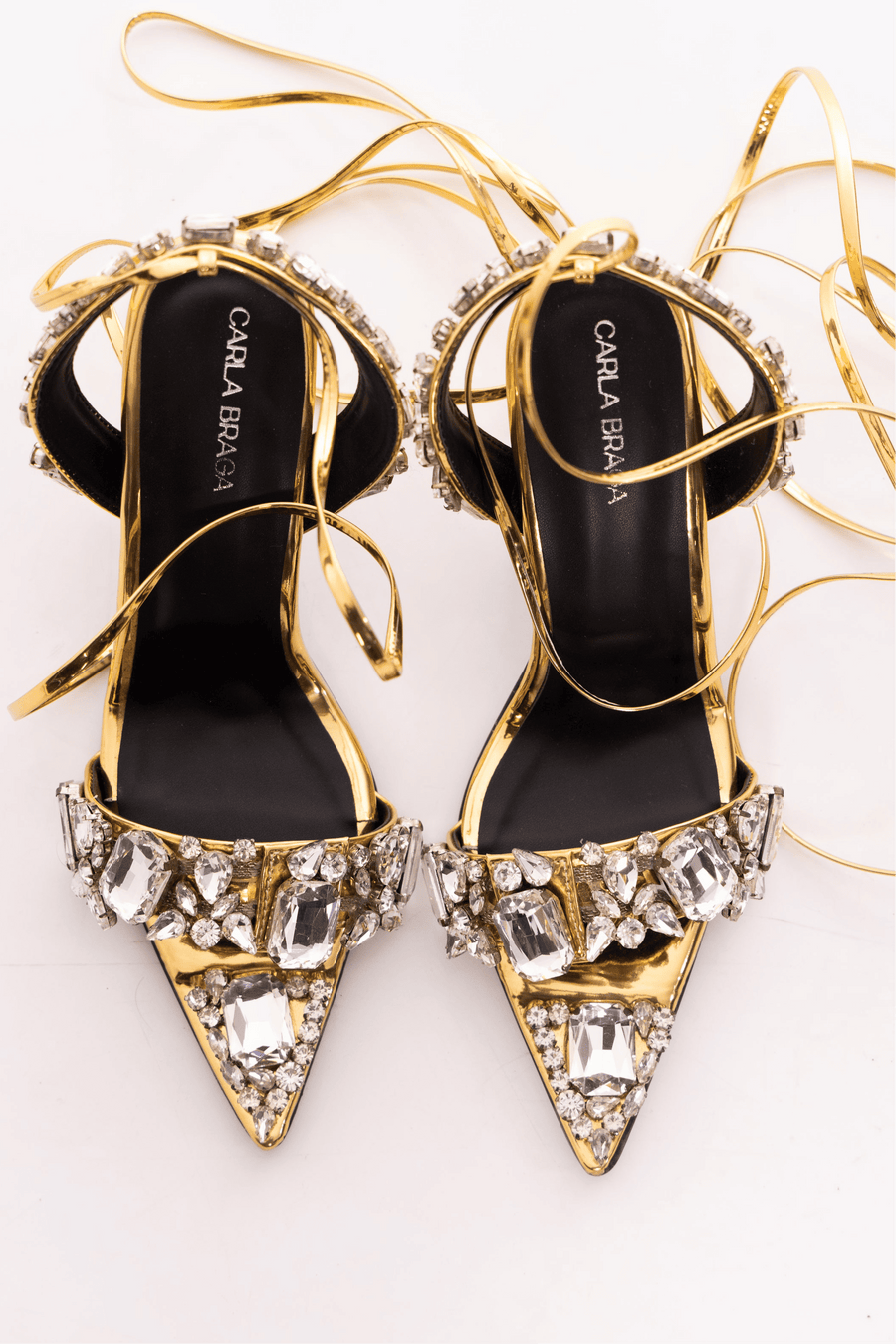 Tryst is a pointed, open-toe sandal designed with bold, sculptural glamour in mind. Big crystal stones mark three key points — the toe, the front strap, and the ankle straps — creating a line of light that catches with every movement. Mirror-finish leather in silver or gold wraps the foot in reflective shine, while delicate tie-up laces add a soft contrast of fluidity and form. Fierce, feminine, and unapologetically striking.