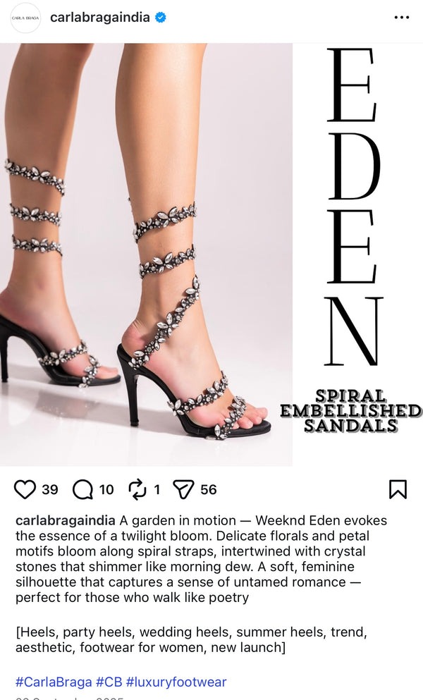 A garden in motion — Weeknd Eden evokes the essence of a twilight bloom. Delicate florals and petal motifs bloom along spiral straps, intertwined with crystal stones that shimmer like morning dew. A soft, feminine silhouette that captures a sense of untamed romance — perfect for those who walk like poetry