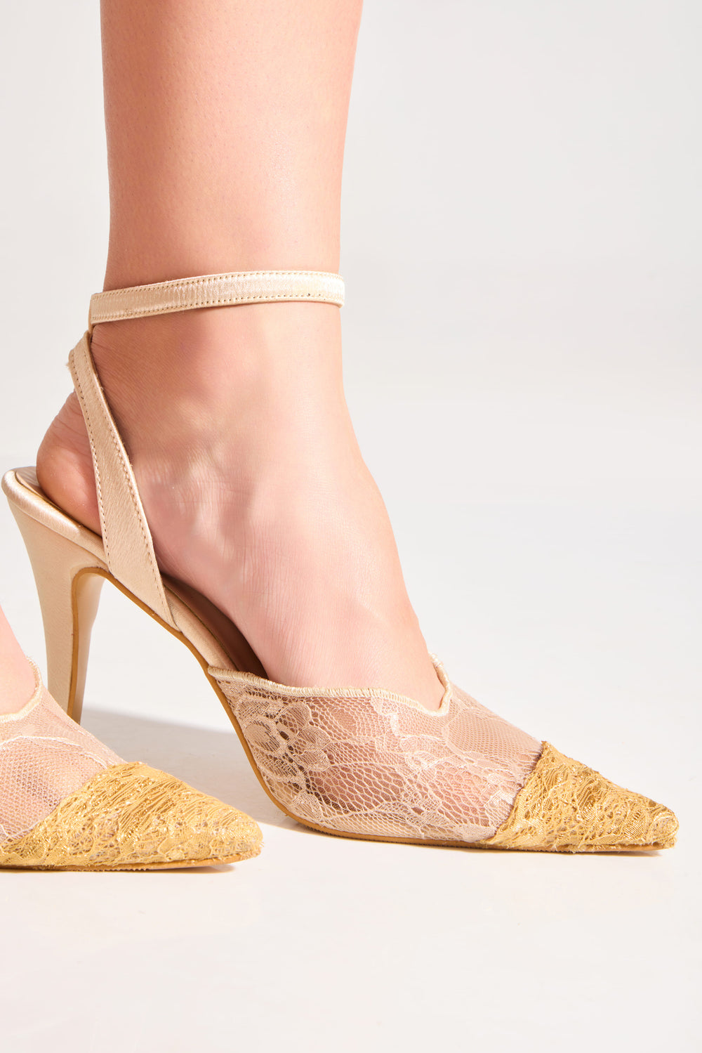 Valentina is sculpted in exquisite lace, where intricate floral motifs trace the silhouette with delicate allure. The lacey pumps are beautifully contrasted by a luminous gold metal lace toe cap. A softly scalloped topline refines the shape, while slender, adjustable ankle straps frame the foot with graceful elegance.
