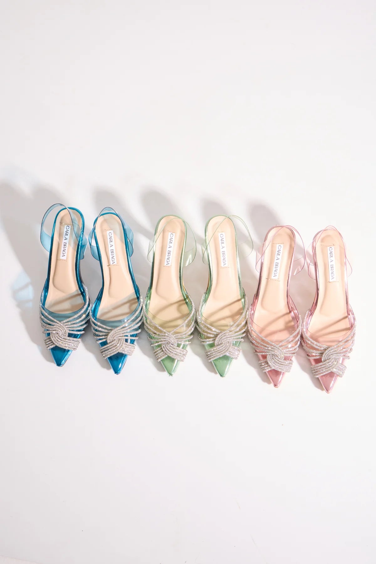 Delicate embellished strings wrap the upper with the same refined artistry, shimmering against hues of turquoise, pink, and mint green — each shade transforming the design’s mood while preserving its weightless elegance.