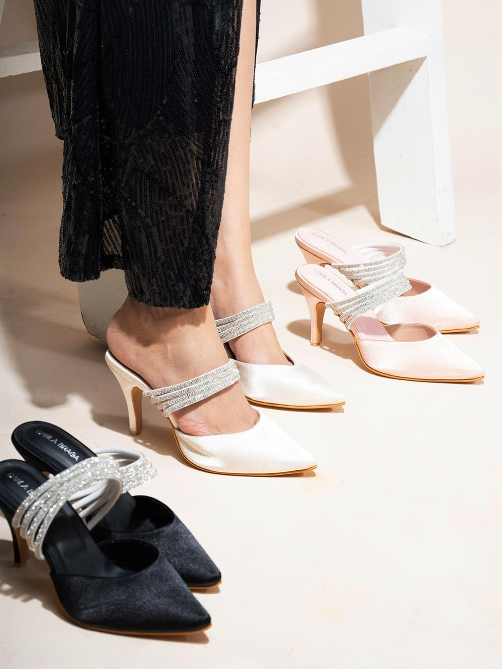 Elevate your date night outfit with these strap embellished heels. This pair is perfect as the heels bedazzles and gives that extra oomph to your date outfit. Pair them with a flattering satin dress and matching embellished box clutch for that perfect date look.